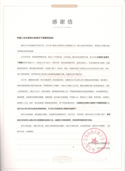 感謝信中指出,2020年初,中國二冶在太原恒大金碧天下首期項目復工復產中,全體員工齊心協力、盡職盡責,響應政府防疫號召,發揚迎難而上、攻堅克難的戰斗精神,全面建成防疫戰線,順利通過政府驗收,并安全、高效、優質地完成了該項目2020年全年的生產任務。為確保工程建設的有序推進、穩步提升,公司發揚了認真負責的態度、辦事高效地工作精神,希望公司確保防疫物資、生產材料的穩定供應,力保太原恒大金碧天下首期項目復工職工能夠在節后有序到場,按期實現工程建設全面復產。