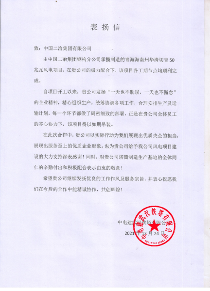 12月24日,中電建武漢鐵塔有限公司給中國(guó)二冶發(fā)來(lái)表?yè)P(yáng)信,贊譽(yù)其在青海海南州華清切吉50兆瓦風(fēng)電項(xiàng)目中所表現(xiàn)出的優(yōu)秀管理水平和優(yōu)良的履約能力。
