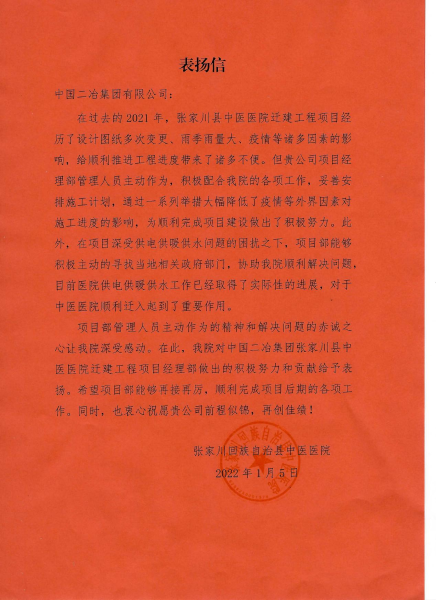 張家川回族自治縣中醫(yī)院對中國二冶張家川項目部管理人員積極協(xié)助業(yè)主解決醫(yī)院供電供暖供水問題給予表揚。信中寫到,中國二冶項目經(jīng)理部管理人員主動作為,積極配合院里的各項工作,妥善安排施工計劃,通過一系列舉措大幅降低了疫情等外界因素對施工進度的影響,為順利完成項目建設(shè)做出了積極貢獻。此外,在項目深受供電供暖供水問題的困擾之下,項目部能夠積極主動地尋找當(dāng)?shù)叵嚓P(guān)政府部門,協(xié)助張家川縣中醫(yī)院順利解決問題,目前醫(yī)院供電供暖供水工作已經(jīng)取得了實質(zhì)性進展,為中醫(yī)院順利喬遷起到了積極推動作用。