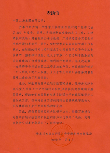 1月5日,中國二冶連續(xù)收到張家川回族自治縣中醫(yī)院、張家川回族自治縣人力資源和社會保障局兩封表揚信。