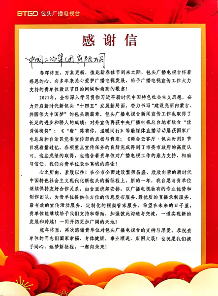 近日,中國二冶收到包頭廣播電視臺感謝信,信中對中國二冶多年來關心愛護包頭廣播電視發(fā)展,給予包頭廣播電視宣傳工作大力支持表示感謝,對中國二冶在2022年包頭廣播電視臺春節(jié)聯歡晚會中文化賦能、品牌推介和全程助力表示崇高的敬意。
