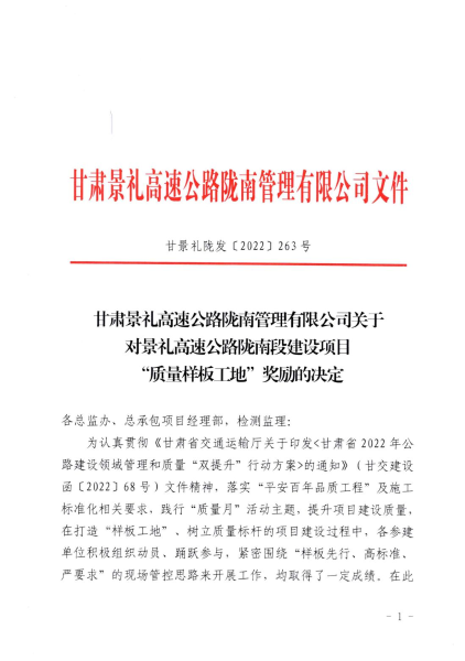 9月28日,甘肅景禮高速公路隴南管理有限公司發布通報,對中國二冶甘肅分公司景禮項目部在“質量樣板工地”評比中獲得優異成績進行通報表揚,景禮項目部二號梁場榮獲“質量樣板工地”獎牌,并給予20萬元嘉獎。