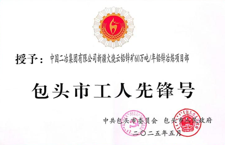 近日,中共包頭市委員會包頭市人民政府公布關于表彰包頭市五一勞動獎的決定,中國二冶新疆火燒云鉛鋅礦60萬噸/年鉛鋅冶煉工程項目榮獲“2025年包頭市工人先鋒號”榮譽稱號